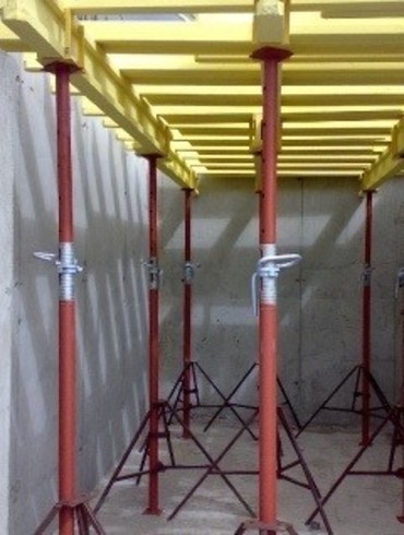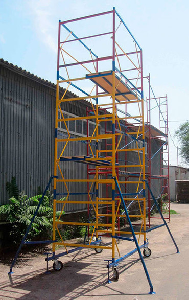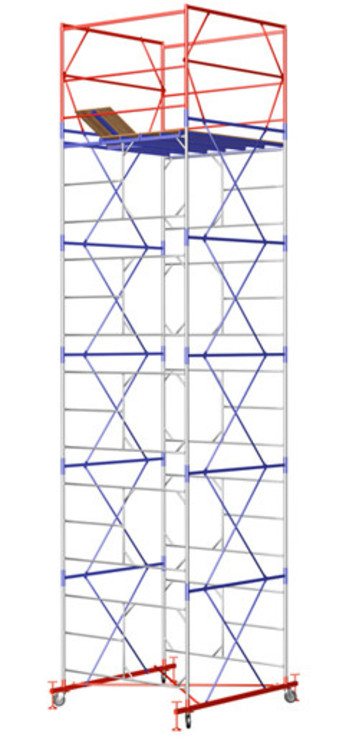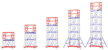 Для большей устойчивости и безопасной работы строителей и рабочих, а также для выравнивания горизонтального расположения вышки на неровной поверхности конструкция вышки оснащена винтовыми опорами.
